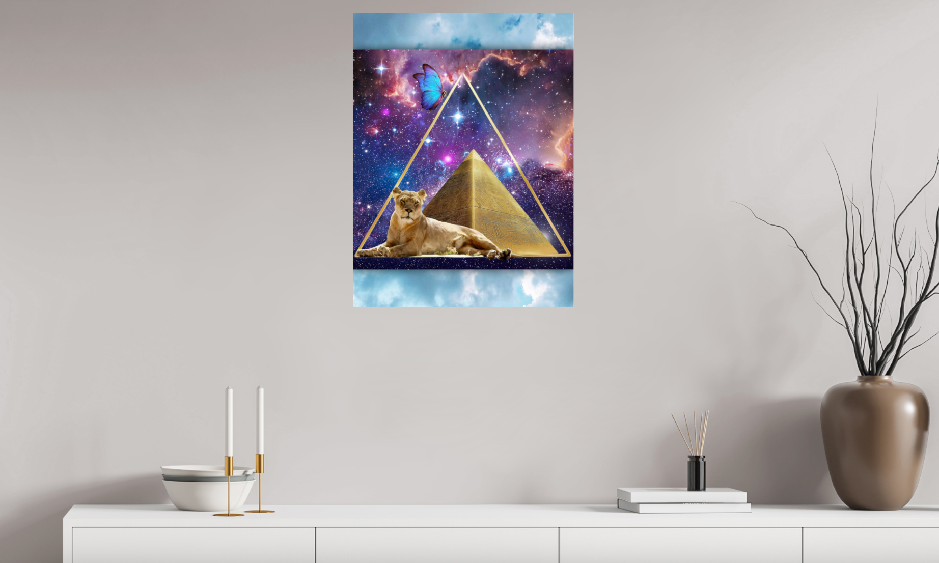 This work layers cosmic imagery with sacred Egyptian symbolism. The lioness lies gracefully, embodying strength and regal presence, while behind her a golden pyramid rises, etched with mystical detail. The pyramid represents a timeless connection to Egypt and the magic of higher dimensions.