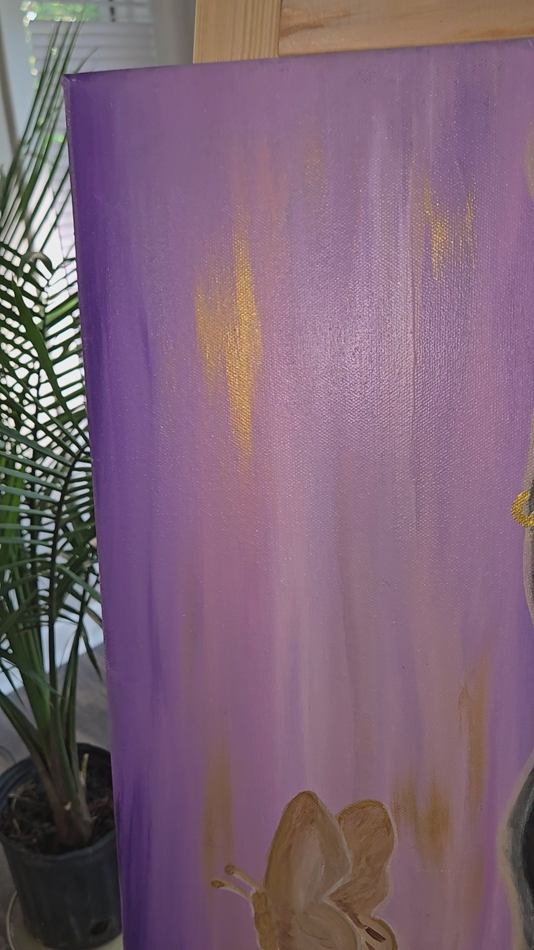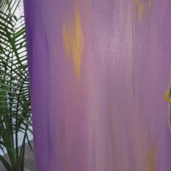 Painted in acrylic on canvas, this piece combines bold symbolism with vibrant, flowing color. The black cat is adorned in golden accents, sacred Egyptian jewels, and the ankh—the eternal key of life—set against a radiant background of purple and gold. The lotus flower, painted with delicate layers of pink and gold, radiates the theme of spiritual blossoming.
